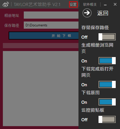 Or choose to monitor the clipboard, after copying the link, the link that conforms to the format can be automatically grabbed, and a pop-up window prompts.Select the album save path, the default is the current directory of the program.
